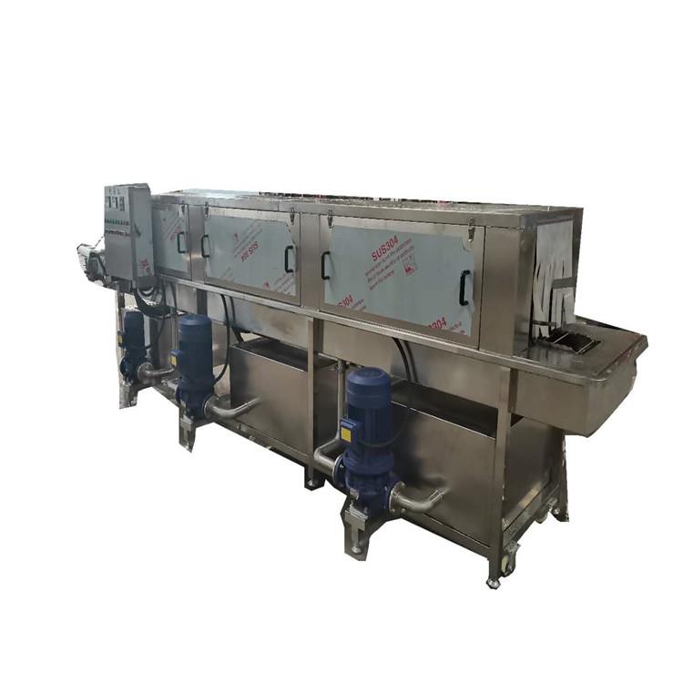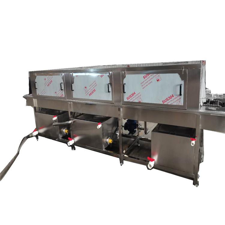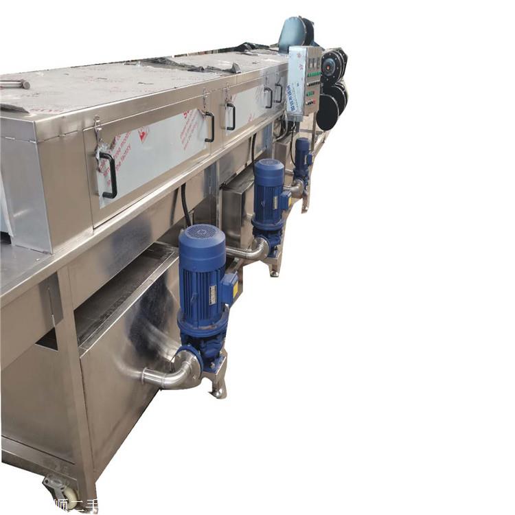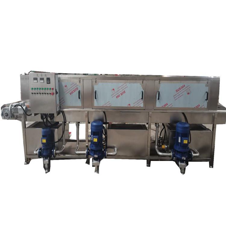 产品详情:洗筐机工作分成三个部分:一个部分是热碱水,第二个部分是开水,第三个部分是自来水,三级喷淋水具有一个单独的循环过滤水箱,除了第三级自来水。加热后,第三级自来水作为补充水循环到第二级水箱。用到后部分污水自动排放,第二个水箱中有一个蒸气加热管,温度可从常温自由设定为100°c,温度自动恒定,第一级水泵功率为5.5kw,第二级水泵功率为5.5kw,第三级水泵功率为0.75kw,输送带电机。